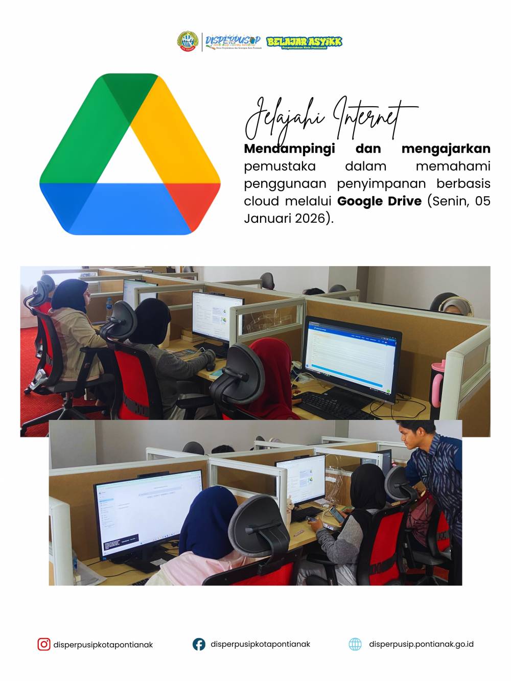 SelengkapnyaMendampingi dan mengajarkan pemustaka dalam memahami penggunaan penyimpanan berbasis cloud melalui Google Drive (Senin, 05 Januari 2026).
