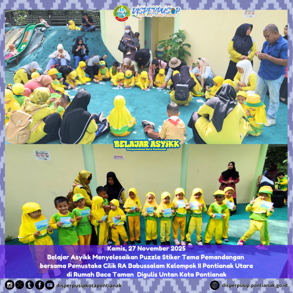 SelengkapnyaBelajar Asyikk Menyelesaikan Puzzle Stiker Tema Pemandangan bersama Pemustaka Cilik RA Babussalam Kelompok I Pontianak Utara di Rumah Baca Digulis Untan Kota Pontianak